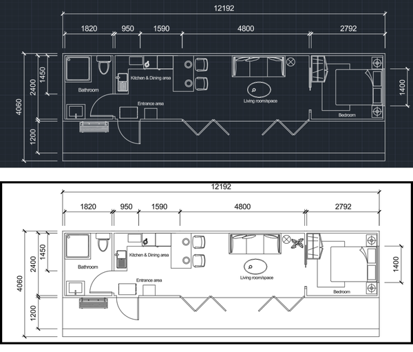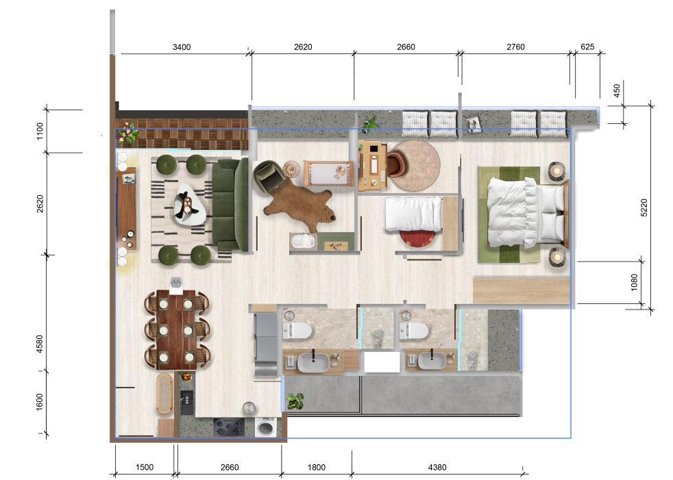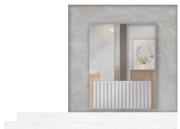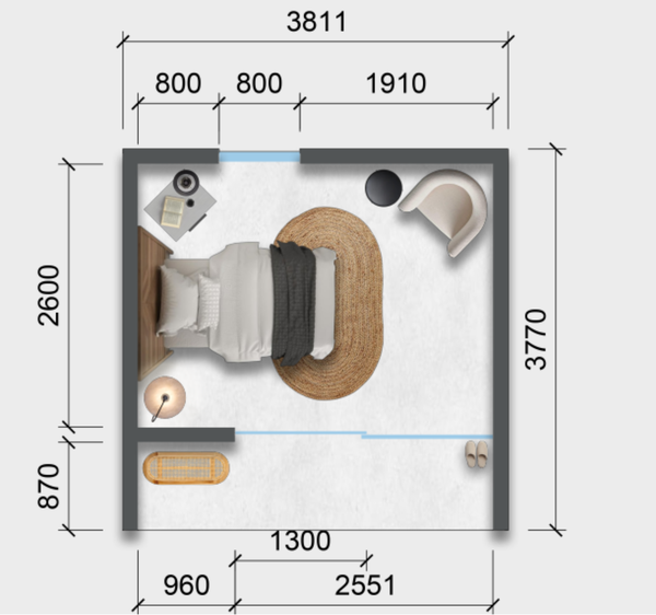 Accommodation Pod(s) - This compact accommodation pod is designed with functional zoning in mind, creating a smooth transition from public to private spaces, starting from the kitchen and dining area, flowing into the living room, and ending at the bedroom. This thoughtful layout promotes both social interaction and personal retreat, supporting comfort, identity, and a sense of belonging. Aesthetically, the space features a modern, minimalist style with warm undertones. Natural materials like warm wood flooring and light marble in the bathroom offer an earthy, timeless look, while clean-lined furniture enhances visual lightness and space efficiency. Technically, the design maximizes space with compact utilities, a tucked-away wet area to simplify plumbing, and a galley kitchen with integrated storage and appliances. Natural lighting and ventilation are optimized through the full-length glass wall and open layout. Wayfinding is intuitive, supported by consistent flooring, clear circulation, and visual anchors like the sofa and bed, which guide orientation. Creative solutions include multi-functional furniture, such as a dining table that doubles as a workspace, and space-saving features like the bench near the bathroom serving as both storage and seating—ensuring practicality without sacrificing comfort or openness.